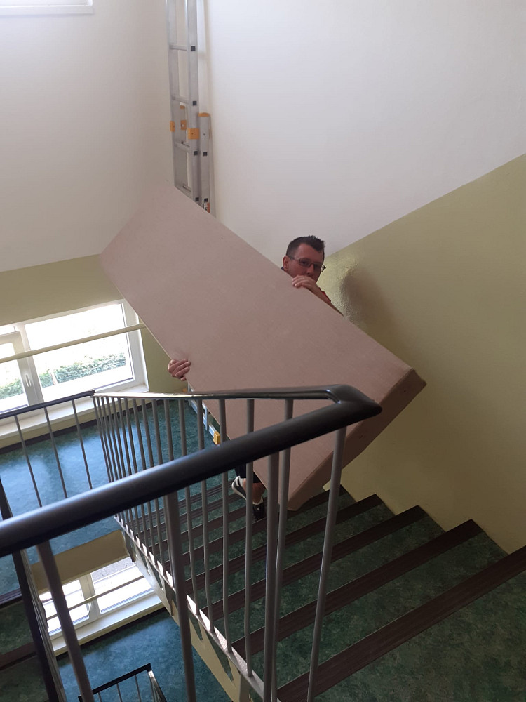 Po přejezdu do Kladna nás čekala větší výzva. Nový byt, kam jsme se stěhovali, neměl výtah. Ale stěhováci z Profigroupu byli připraveni i na tuto situaci. S pomocí speciálního vybavení a opět s obdivuhodnou týmovou prací začali vykládat věci z dodávky a nesli je po schodech do mého nového bytu.